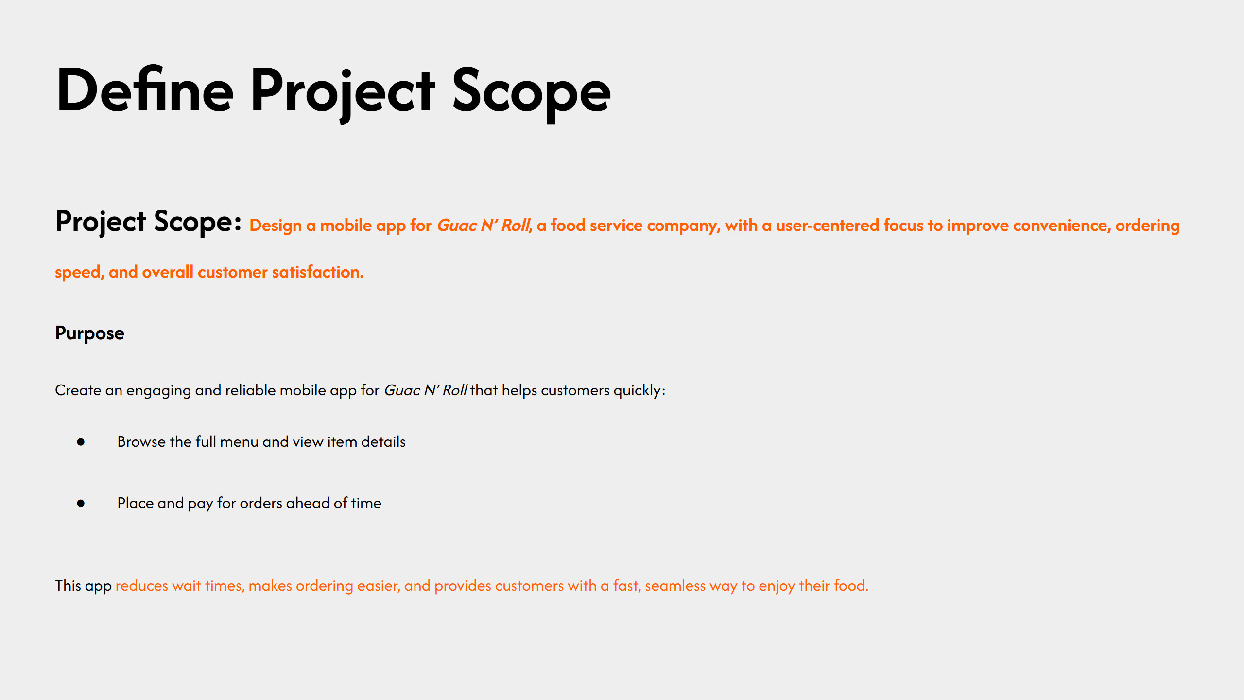 Designing a mobile app for Guac N’ Roll, a food service company, with a user-centered focus to improve convenience, ordering speed, and overall customer satisfaction